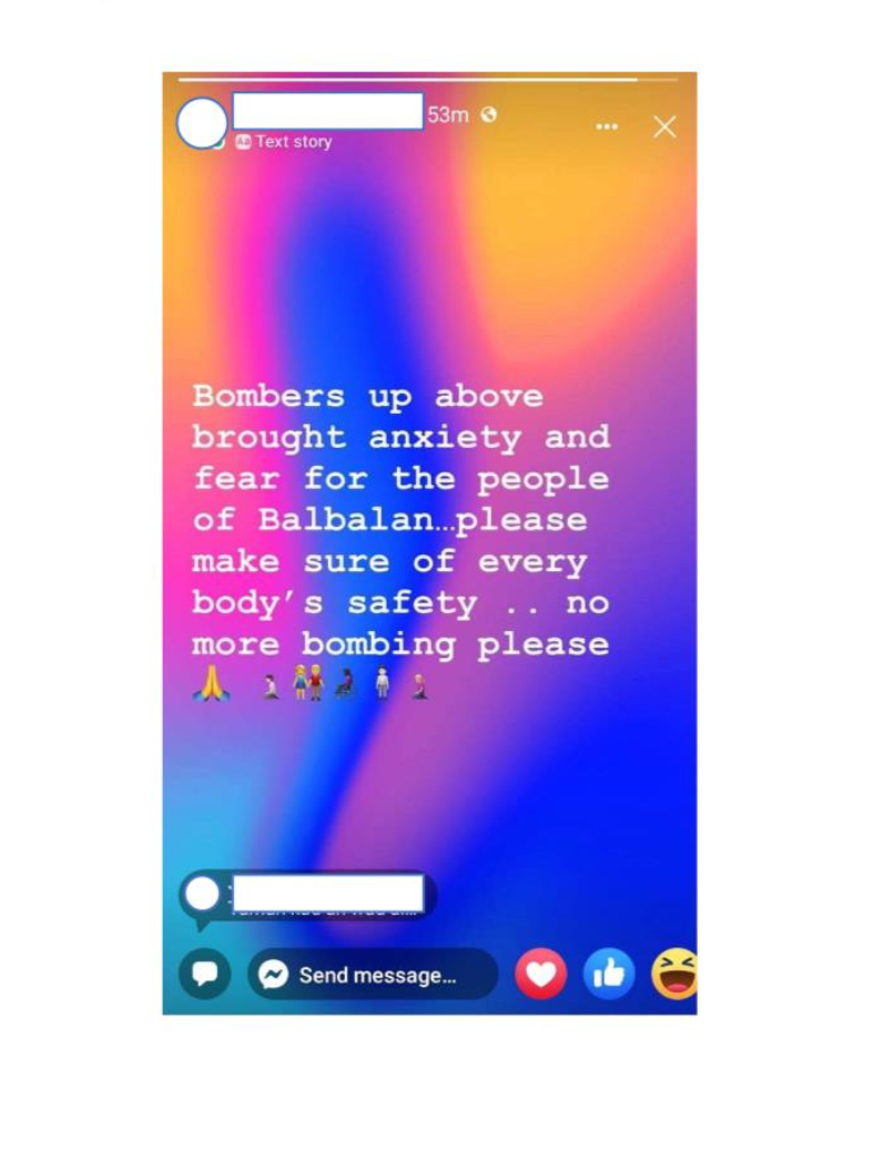 "We are reminding (government forces) that the bombing of schools, hospitals, or any civilian institution violates IHL (International Humanitarian Law). It is the responsibility of the State to respect this. Schools are zones of peace and are regarded under IHL as protected civilian objects. Attacks on schools during conflict is one of the six grave violations against children in situations of armed conflict identified and condemned by the UN Security Council."