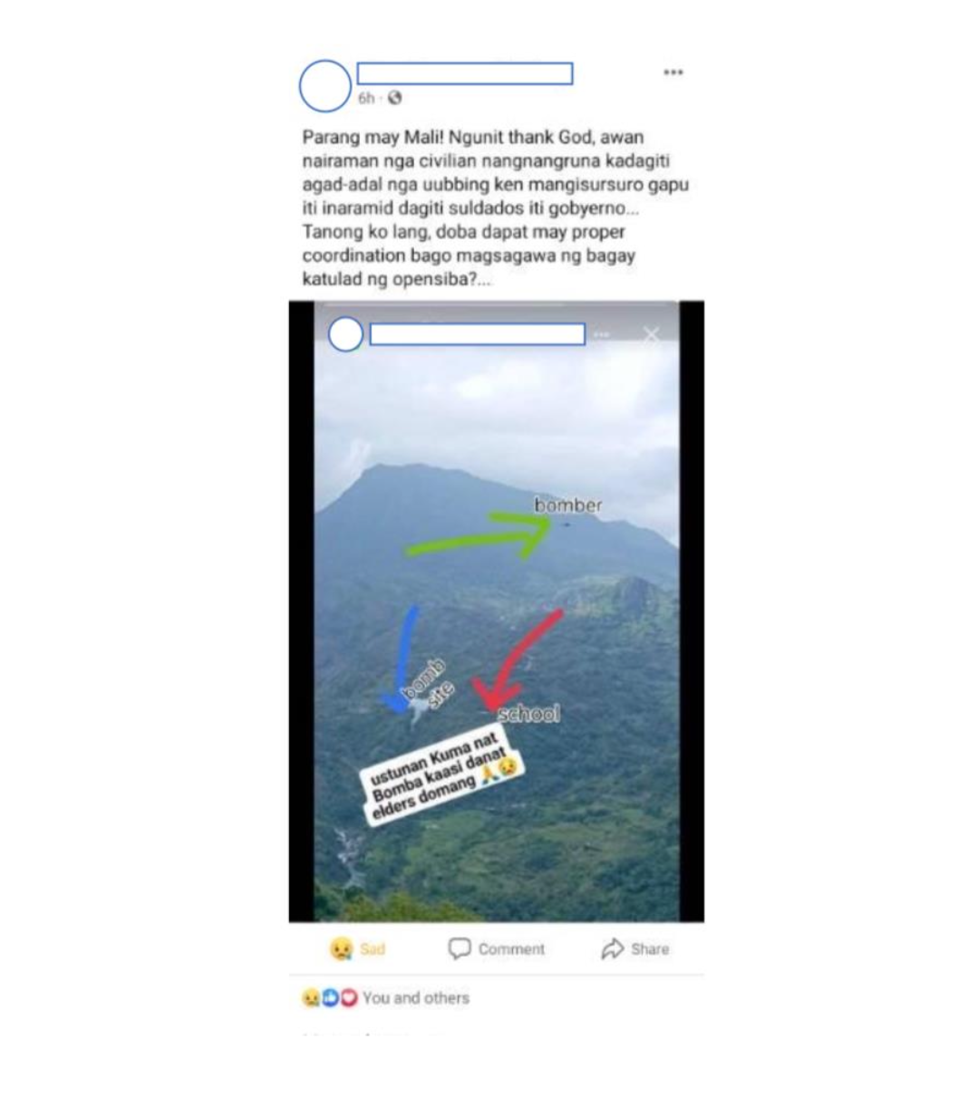 A Facebook post of a Gawaan resident shows how near the bombing site was to the elementary school. It had the caption (translated in English): "This seems to be wrong! But thank God, there were no civilians hurt especially the students and teachers because of what the government soldiers did..." (Image courtesy of Eufemia Bog-as)